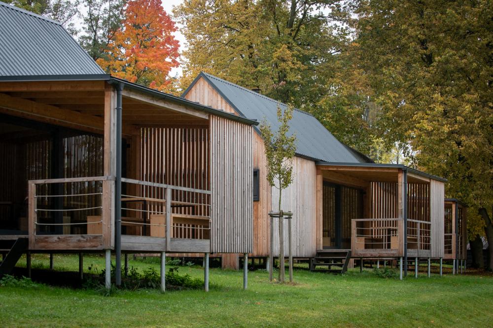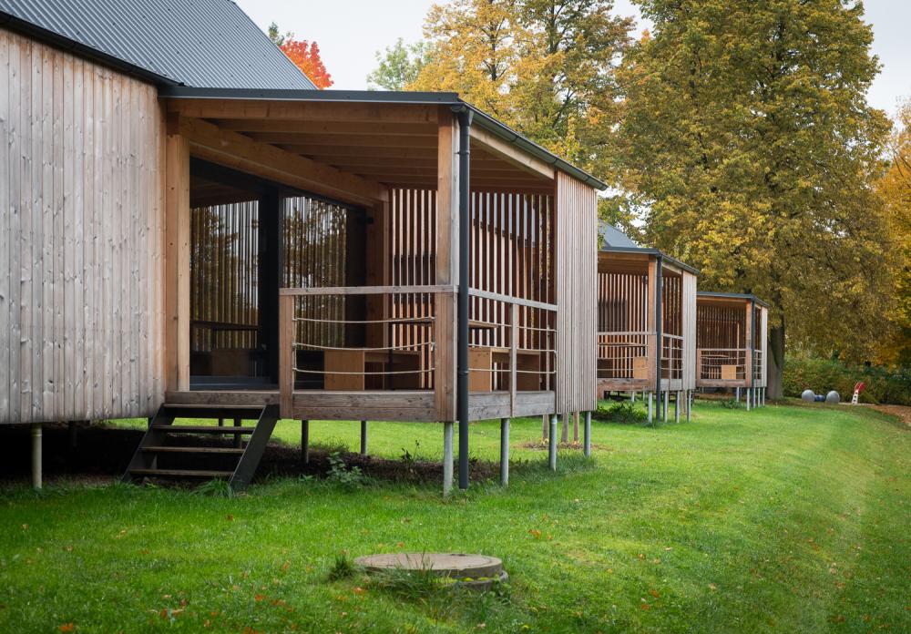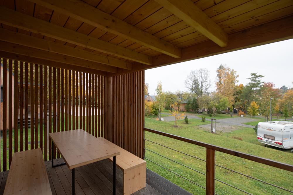 Chata, která je v provozu od léta 2023 je umístěna v klidné části kempu.