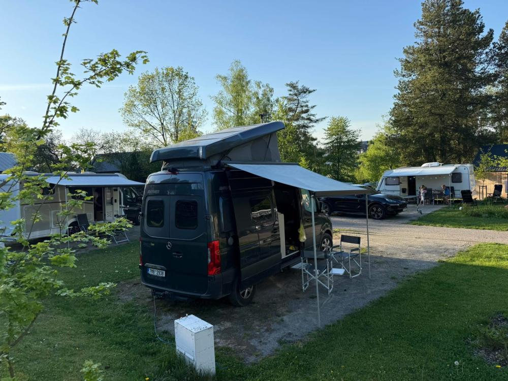 Hardstanding pitches for karavans and motorhomes are available all year round and are all equipped with power supply.